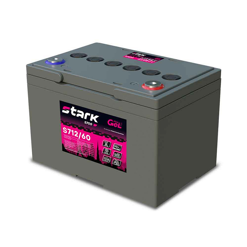 Stark S712/60 может работать как в буферном, так и в циклическом режиме, а значит подходит не только для стационарного применения, но и для тягового (циклического): инвалидные кресла, электротранспорт, погрузочная техника, системы охраны и безопасности, сигнализация, телекоммуникационное оборудование, связь, уборочная и поломоечная техника, источники бесперебойного питания, производство, распределение электроэнергии, железные дороги. Благодаря загущенному электролиту эксплуатировать Stark S712/60 можно даже при экстремальных температурах. Саморазряд свинцово-кислотной батареи низкий — срок хранения без подзаряда достигает 2 лет. Решётки намазных пластин обладают повышенной устойчивостью к коррозии и механическим воздействиям, это обеспечивает аккумулятору устойчивость к частым глубоким разрядам.