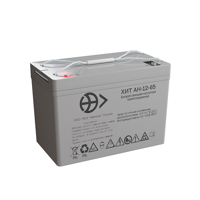 Герметизированный необслуживаемый свинцово-кислотный аккумулятор ВАЗ Импульс АН 12-65 (12 В; 65 Ач) производится по техническим условиям ЖТПИ.563415.001 ТУ, что обеспечивает повышенную надёжность, проверенную испытаниями и подходит для ответственных узлов. Батарея изготовлена по технологии AGM: микропористый стекловолоконный сепаратор удерживает кислотный раствор. Это положительно сказывается на сроке службы акб: циклический ресурс по ГОСТ Р МЭК 60896-21 составляет 400 циклов или 15 лет в буферном режиме. ВАЗ Импульс АН 12-65 не требует обслуживания, под давлением рекомбинируется более 98% газов.