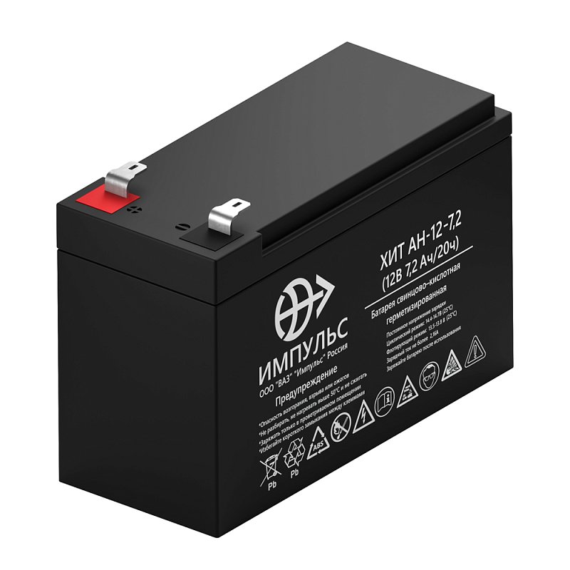 Герметизированный необслуживаемый свинцово-кислотный аккумулятор ВАЗ Импульс ХИТ АН 12-7.2 (12 В; 7.2 Ач) производится по техническим условиям ЖТПИ.563415.001 ТУ, что обеспечивает повышенную надёжность, проверенную испытаниями и подходит для ответственных узлов. Батарея изготовлена по технологии AGM: микропористый стекловолоконный сепаратор удерживает кислотный раствор. Это положительно сказывается на сроке службы акб: циклический ресурс по ГОСТ Р МЭК 60896-21 составляет 400 циклов или 10 лет в буферном режиме. ВАЗ Импульс ХИТ АН 12-7 не требует обслуживания, под давлением рекомбинируется более 98% газов.