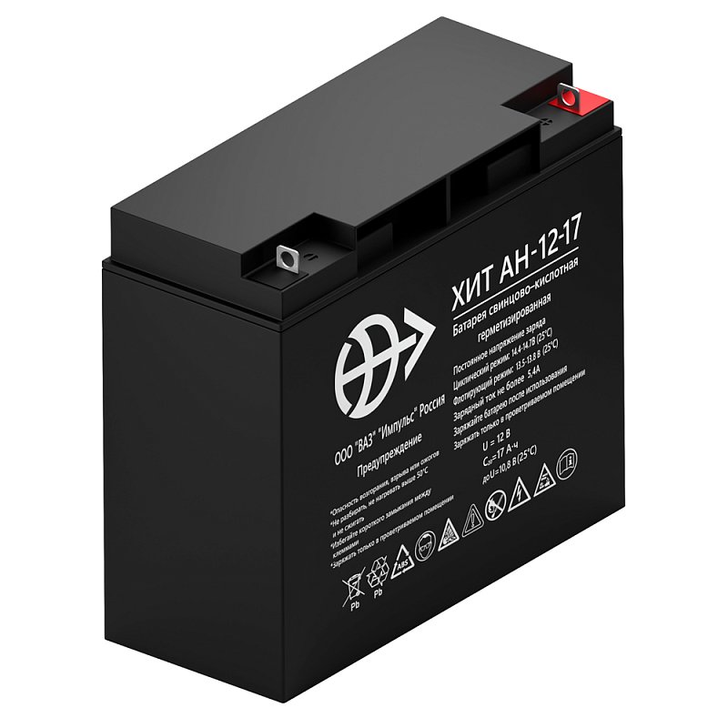 Герметизированный необслуживаемый свинцово-кислотный аккумулятор ВАЗ Импульс ХИТ АН 12-17 (12 В; 17 Ач) производится по техническим условиям ЖТПИ.563415.001 ТУ, что обеспечивает повышенную надёжность, проверенную испытаниями и подходит для ответственных узлов. Батарея изготовлена по технологии AGM: микропористый стекловолоконный сепаратор удерживает кислотный раствор. Это положительно сказывается на сроке службы акб: циклический ресурс по ГОСТ Р МЭК 60896-21 составляет 400 циклов или 15 лет в буферном режиме. ВАЗ Импульс ХИТ АН 12-17 не требует обслуживания, под давлением рекомбинируется более 98% газов.