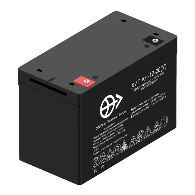 Герметизированный необслуживаемый свинцово-кислотный аккумулятор ВАЗ Импульс ХИТ АН-12-26У (12 В; 26 Ач) производится по техническим условиям ЖТПИ.563415.001 ТУ, что обеспечивает повышенную надёжность, проверенную испытаниями и подходит для ответственных узлов. Батарея изготовлена по технологии AGM: микропористый стекловолоконный сепаратор удерживает кислотный раствор. Это положительно сказывается на сроке службы акб: циклический ресурс по ГОСТ Р МЭК 60896-21 составляет 400 циклов или 15 лет в буферном режиме. ВАЗ Импульс ХИТ АН-12-26У не требует обслуживания, под давлением рекомбинируется более 98% газов.