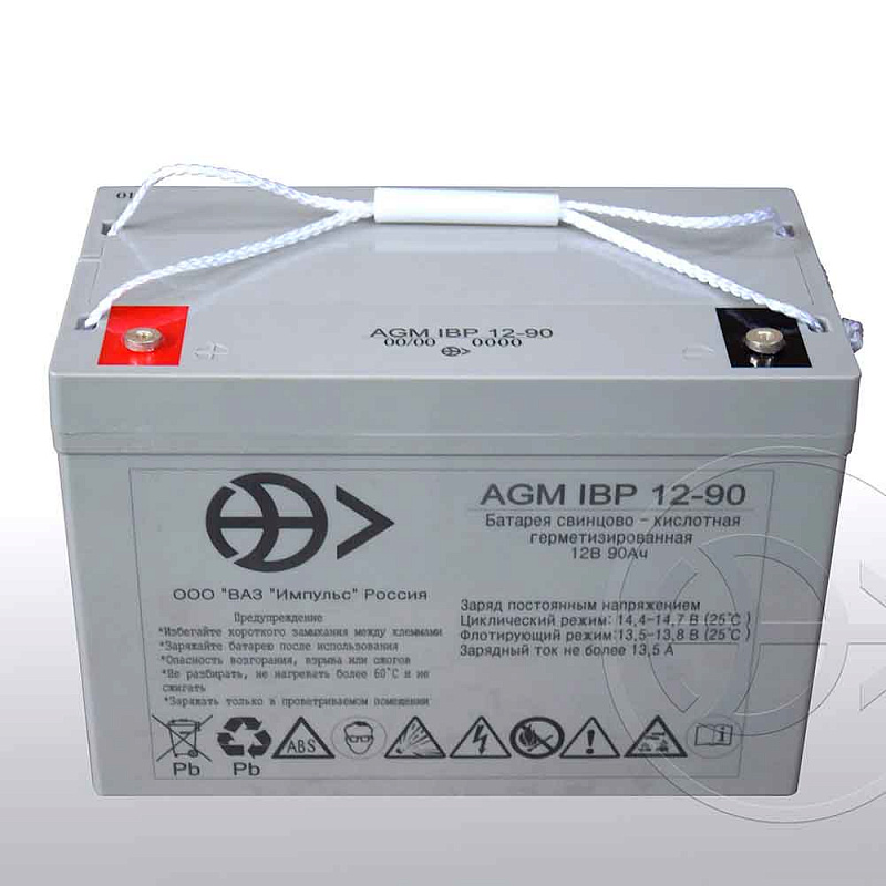Свинцово-кислотный AGM аккумулятор ВАЗ Импульс IBP 12-90 производится в России в г. Велики Луки (ЛО) напряжением 12В и мощностью 90 Ач и предназначены для источников бесперебойного питания, систем связи, а также охранного и пожарного оборудования. Технология AGM обеспечивает продолжительный срок службы до 12 лет при соблюдении правил эксплуатации. Корпус ВАЗ Импульс IBP 12-90 выполнен из прочного огнеупорного ABS пластика и надёжно герметизирован, обслуживать батарею не требуется. Пастированные электроды выполнены из высококачественного свинцово-кальциевого сплава, это обеспечивает высокую прочность решётки и низкий саморазряд батареи. Свинцово-кислотный аккумулятор ВАЗ Импульс IBP 12-90 полностью соответствует международным стандартам безопасности.