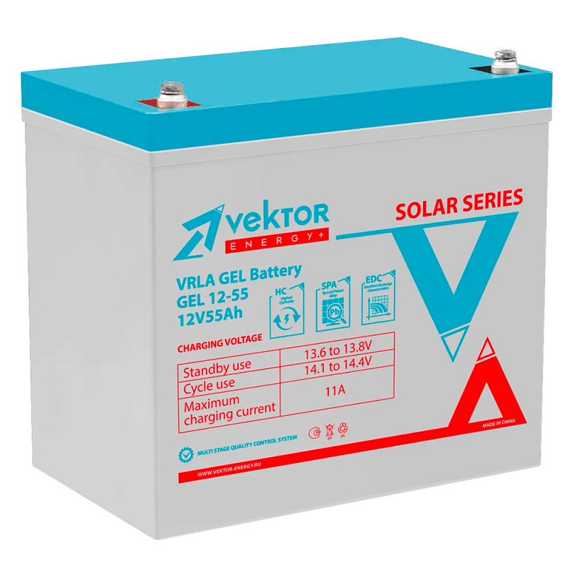 Свинцово-кислотный аккумулятор Vektor GEL 12-55 производится напряжением 12 В и ёмкостью 55 Ач по технологии GEL. Электролит внутри батареи загущен до гелеобразного состояния и удерживается AGM сепаратором. Это сочетание позволяет удерживать электролит в неподвижном состоянии, это положительно сказывается на сроке службы, устойчивости к воздействию вибраций и экстремальных температур и глубоким разрядам. Срок службы Vektor GEL 12-55 в буферном режиме при правильно эксплуатации может составлять более 13 лет и в отличии от других гелевых батарей лучше восстанавливается после глубоких разрядов. Герметичный корпус выполнен из прочного ABS пластика, обслуживать акб не треуется. Пластины изготовлены из специального Pb-Ca-Sn-Al сплава с технологией двойного проката и высокотемпературного отверждения Deep Cycle: это обеспечивает высокую плотность энергии и защищает их от коррозии. Vektor GEL 12-55 подходит для источников бесперебойного питания, инвалидных кресел, гольф-каров, альтернативной энергетики, электрических игрушек, серверов и телекоммуникационного оборудования. Дата производства аккумулятора Vektor GEL 12-55 указана на крышке в виде символьного кода.