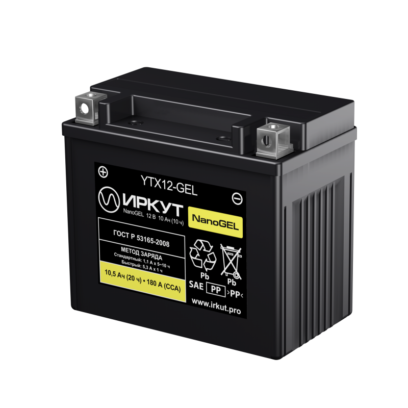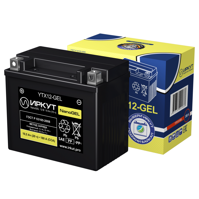 Стартерный аккумулятор Иркут YTX12-GEL (напряжение 12 В, ёмкость 10 Ач) разработан специально для мототехники. Его главная особенность — повышенная виброустойчивость. Иркут YTX12-GEL производится по технологии GEL — кислота удерживается неподвижно внутри мелкопористых стекловолоконных сепараторов. Это повышает устойчивость к температурному воздействию. Дата производства аккумулятора Иркут YTX12-GEL указана на крышке в виде символьного кода.