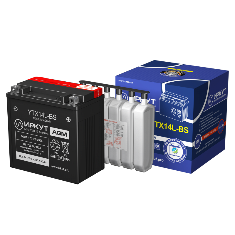 Сухозарядный стартерный аккумулятор Иркут YTX14L-BS (напряжение 12 В, ёмкость 12 Ач) разработан специально для мототехники. Его главная особенность — повышенная виброустойчивость. Электролит поставляется отдельно, что обеспечивает повышенный срок хранения до заправки батареи. Иркут YTX14L-BS производится по технологии AGM — кислота удерживается неподвижно внутри мелкопористых стекловолоконных сепараторов. Это повышает устойчивость к температурному воздействию. Дата производства аккумулятора Иркут YTX14L-BS указана на крышке в виде символьного кода.