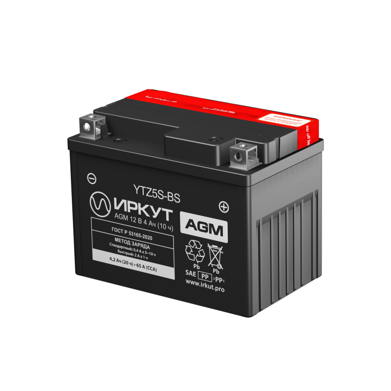 Сухозарядный стартерный аккумулятор Иркут YTZ5S-BS (напряжение 12 В, ёмкость 4 Ач) разработан специально для мототехники. Его главная особенность — повышенная виброустойчивость. Электролит поставляется отдельно, что обеспечивает повышенный срок хранения до заправки батареи. Иркут YTZ5S-BS производится по технологии AGM — кислота удерживается неподвижно внутри мелкопористых стекловолоконных сепараторов. Это повышает устойчивость к температурному воздействию. Дата производства аккумулятора Иркут YTZ5S-BS указана на крышке в виде символьного кода.