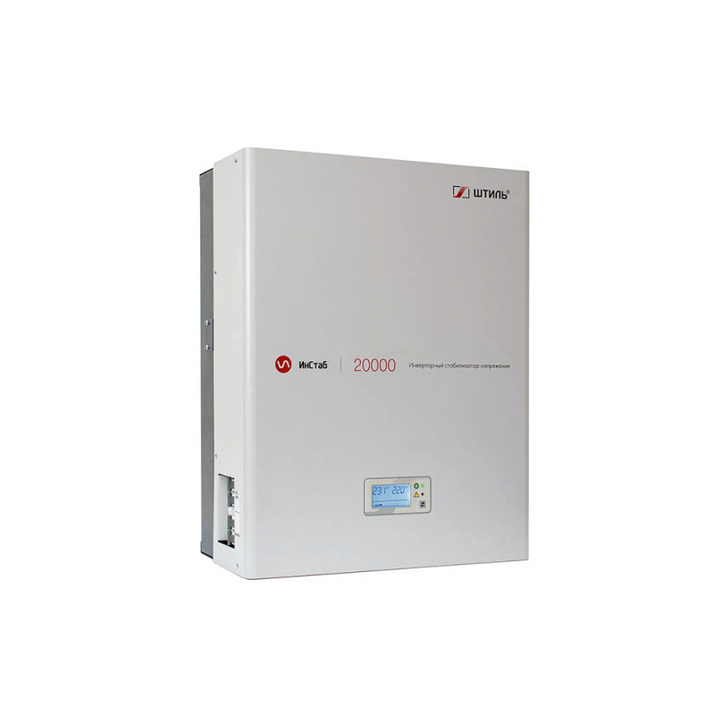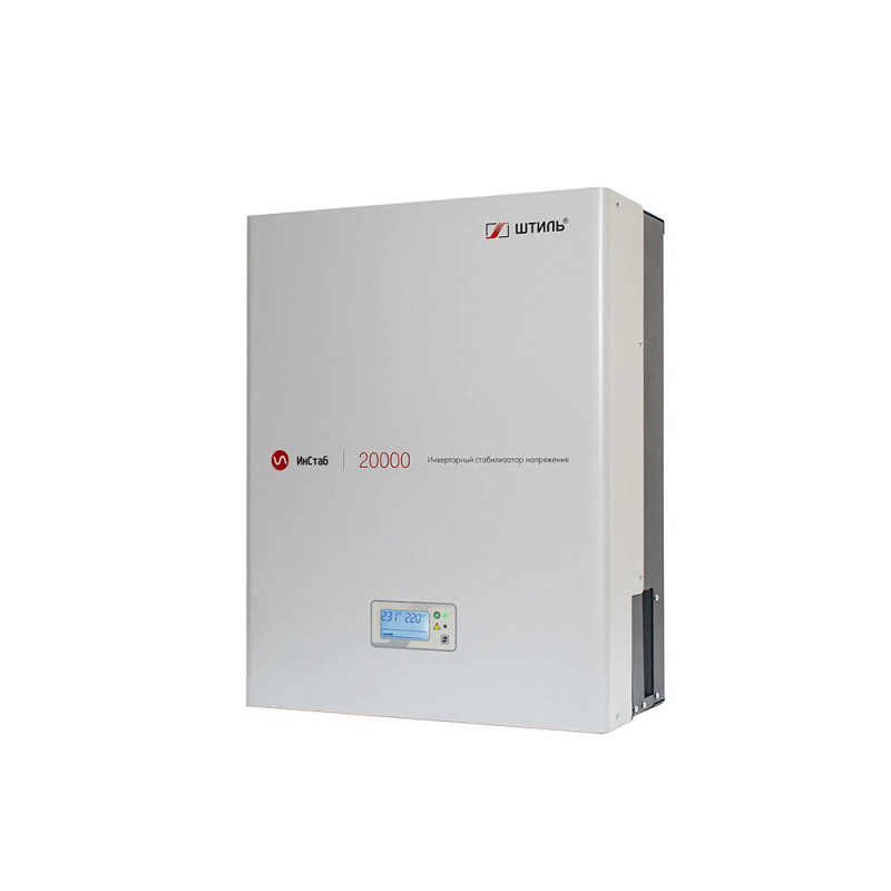 Однофазный (1-1) настенный инверторный стабилизатор напряжения Штиль IS20000 производится в России мощностью 20 кВА / 18 кВт. Он подходит для обеспечения стабильного электропитания такого оборудования, как: системы ГВС и водоснабжения, компьютерной техники, телевизоров и аудио-видео аппаратуры, холодильников, электроинструментов и охранных систем. Штиль IS20000 разработан с учётом специфики российских электрических сетей и полностью соответствует требованиям Таможенного союза (ЕАС). Топология двойного преобразования (Online) обеспечивает целый ряд преимуществ: мгновенная реакция на изменение параметров сети (0 мс), высокая точность коррекции напряжения и выдаёт на выходе идеальную синусоиду. При кратковременном отключении сети нагрузка обеспечивается ещё 200 мс.