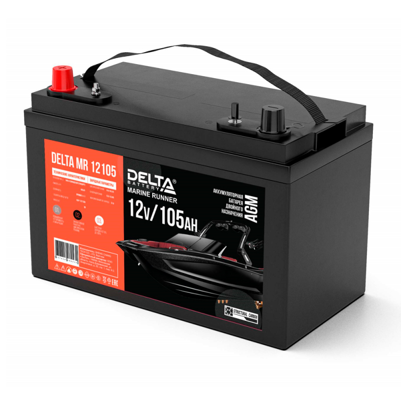 Тяговый аккумулятор двойного назначения Delta MR 12105 (12 В, 105 Ач) разработаны специально для водного транспорта. Два комплекта клемм позволяют одновременно запитать электромотор и бортовое оборудование. Батарея защищена от вибрации, ударов, воздействия температур и влаги, корпус надёжно герметизирован, отсутствует жидкий электролит, это повышает безопасность эксплуатации и позволяет использовать акб в любом положении. Тяговый аккумулятор Delta MR 12105 предназначен для работы в циклическом режиме: более 800 циклов разряд-заряд. Высокая плотность активного материала и сверхпрочный стекловолоконный сепаратор обеспечивают устойчивость к глубоким разрядам и быстрое восстановление после них. Тяговый аккумулятор Delta MR 12105 двойного назначения объединяет в себе высокие стартерные токи и стабильную работу в циклическом режиме, а также минимизирует негативные факторы эксплуатации водного транспорта: высокую влажность и вибрацию.