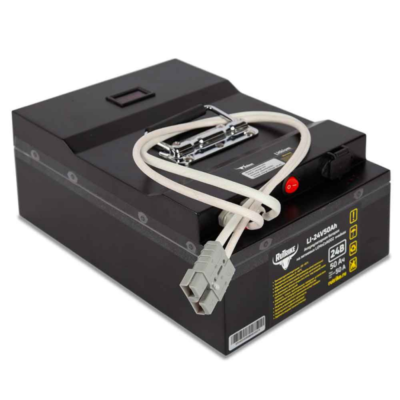 Тяговый аккумулятор RuTrike (18650 MnCoNi) 24V50A/H поставляется со встроенным блоком управления (Battery Management System), он регулирует параметры заряда и разряда, следит за температурой и защищает АКБ. Литиевая батарея предназначена для высоких нагрузок и обладает повышенной токоотдачей. Она подходит для любой поломоечной и уборочной техники от любых производителей, погрузчиков, автомобилей и мотоциклов с электрическими двигателями. Корпус выполнен из металла и надёжно герметизирован, клеммы выполнены в виде силового разъёма.