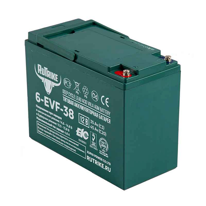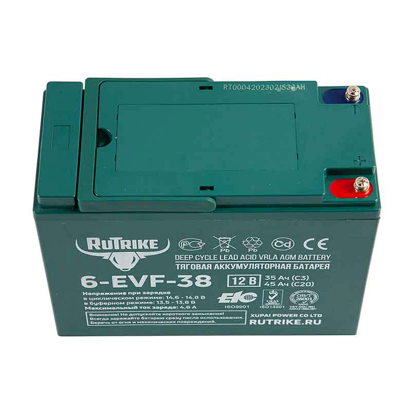 Свинцово-кислотный тяговый аккумулятор RuTrike 6-EVF-38 (ёмкость 45 Ач, напряжение 12 В) производится по технологии GEL и рекомендован для техники на электрической тяге. Электролит загущен до желеобразного состояния, благодаря чему батарея более устойчива к температурному воздействию и глубоким разрядам. Гелевые аккумуляторы отличаются повышенным числом циклов заряд-разряд: более 700 при DOD (глубине разряда) 80%. Пластины тягового аккумулятора снабжены более плотным активным материалом, благодаря этому они устойчивы к глубоким разрядам и не теряют ёмкость. Тяговый аккумулятор RuTrike 6-EVF-38 применяется в различной технике с электродвигателями. Корпус выполнен из ударопрочного ABS пластика и надёжно герметизирован. На крышке аккумулятора RuTrike 6-EVF-38 предусмотрен односторонний клапан избыточного давления. Дата производства аккумулятора RuTrike 6-EVF-38 указана на крышке в виде символьного кода.