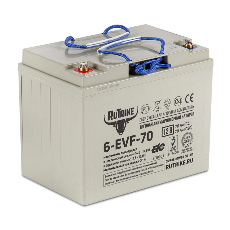 Свинцово-кислотный тяговый аккумулятор RuTrike 6-EVF-70 (ёмкость 78 Ач, напряжение 12 В) производится по технологии AGM и рекомендован для техники на электрической тяге. Электролитом пропитаны микропористые сепараторы из стекловолокна, благодаря чему батарея более устойчива к температурному воздействию и глубоким разрядам. Такие аккумуляторы отличаются повышенным числом циклов заряд-разряд: более 700 при DOD (глубине разряда) 80%. Пластины тягового аккумулятора снабжены более плотным активным материалом, благодаря этому они устойчивы к глубоким разрядам и не теряют ёмкость. Тяговый аккумулятор RuTrike 6-EVF-70 применяется в различной технике с электродвигателями. Корпус выполнен из ударопрочного ABS пластика и надёжно герметизирован. На крышке аккумулятора RuTrike 6-EVF-70 предусмотрен односторонний клапан избыточного давления. Дата производства аккумулятора RuTrike 6-EVF-70 указана на крышке в виде символьного кода.