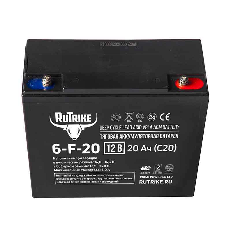Свинцово-кислотный тяговый аккумулятор RuTrike 6-F-20 (ёмкость 22 Ач, напряжение 12 В) производится по технологии GEL и рекомендован для техники на электрической тяге. Электролит загущен до желеобразного состояния, благодаря чему батарея более устойчива к температурному воздействию и глубоким разрядам. Гелевые аккумуляторы отличаются повышенным числом циклов заряд-разряд: более 700 при DOD (глубине разряда) 80%. Пластины тягового аккумулятора снабжены более плотным активным материалом, благодаря этому они устойчивы к глубоким разрядам и не теряют ёмкость. Тяговый аккумулятор RuTrike 6-F-20 применяется в различной технике с электродвигателями. Корпус выполнен из ударопрочного ABS пластика и надёжно герметизирован. На крышке аккумулятора RuTrike 6-F-20 предусмотрен односторонний клапан избыточного давления. Дата производства аккумулятора RuTrike 6-F-20 указана на крышке в виде символьного кода.