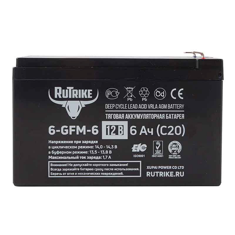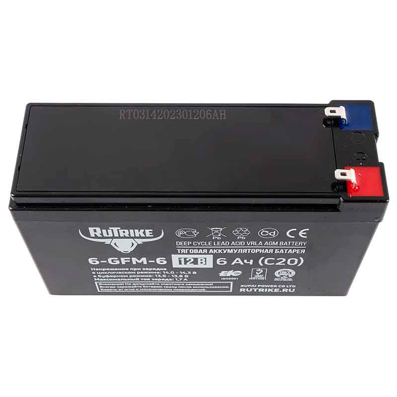 Свинцово-кислотный тяговый аккумулятор RuTrike 6-GFM-6 (ёмкость 6 Ач, напряжение 12 В) производится по технологии GEL и рекомендован для техники на электрической тяге. Электролит загущен до желеобразного состояния, благодаря чему батарея более устойчива к температурному воздействию и глубоким разрядам. Гелевые аккумуляторы отличаются повышенным числом циклов заряд-разряд: более 700 при DOD (глубине разряда) 80%. Пластины тягового аккумулятора снабжены более плотным активным материалом, благодаря этому они устойчивы к глубоким разрядам и не теряют ёмкость. Тяговый аккумулятор RuTrike 6-GFM-6 применяется в различной технике с электродвигателями. Корпус выполнен из ударопрочного ABS пластика и надёжно герметизирован. На крышке аккумулятора RuTrike 6-GFM-6 предусмотрен односторонний клапан избыточного давления. Дата производства аккумулятора RuTrike 6-GFM-6 eказана на крышке в виде символьного кода.