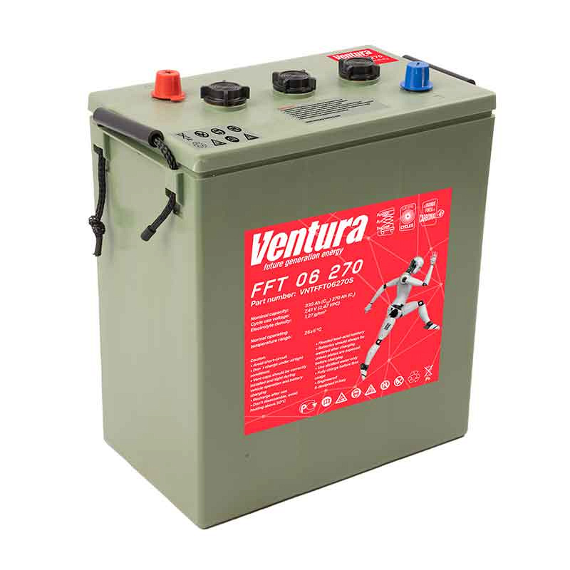 Тяговый аккумулятор Ventura FFT 06 270 производятся ёмкостью C5 270 Ач и напряжением 6 В с применением технологии WET. Главная особенность этой батареи — продолжительный срок службы: до 1000 циклов при DOD = 60%. Внутри тягового АКБ Ventura FFT 06 270 расположены трубчатые пластины из специального сплава. Это обеспечивает быструю подзарядку батареи за счёт низкого внутреннего сопротивления. Тяговый аккумулятор Ventura FFT 06 270 разработан специально для работы в тяжёлых условиях. Эксплуатировать батарею можно даже в экстремальных условиях.