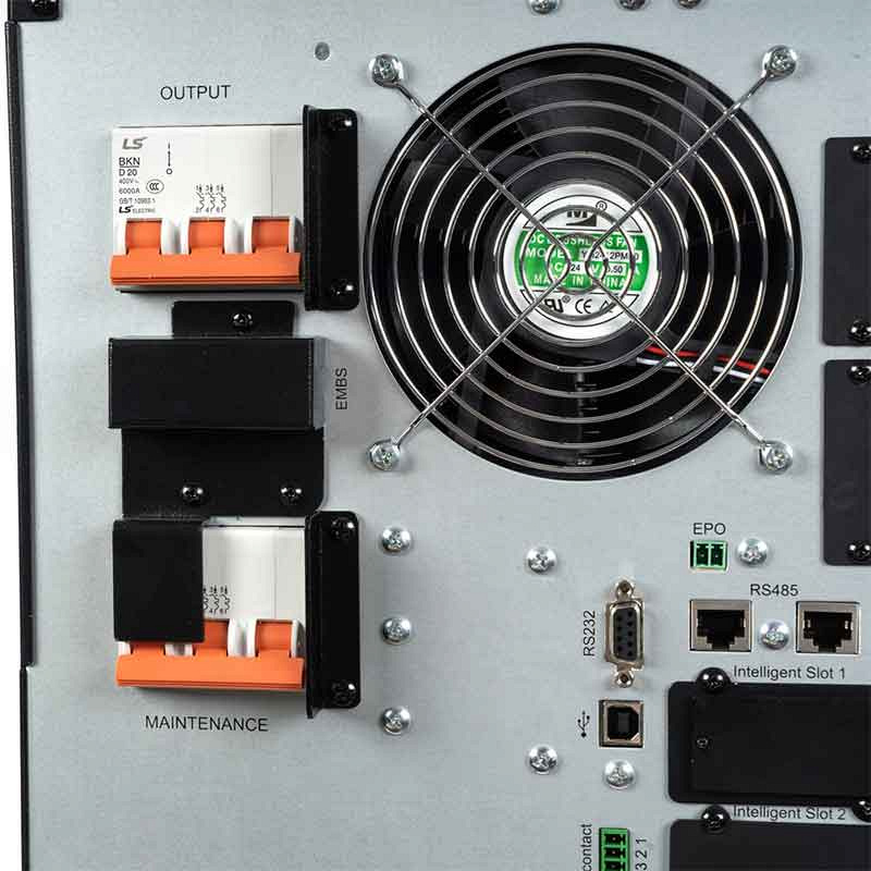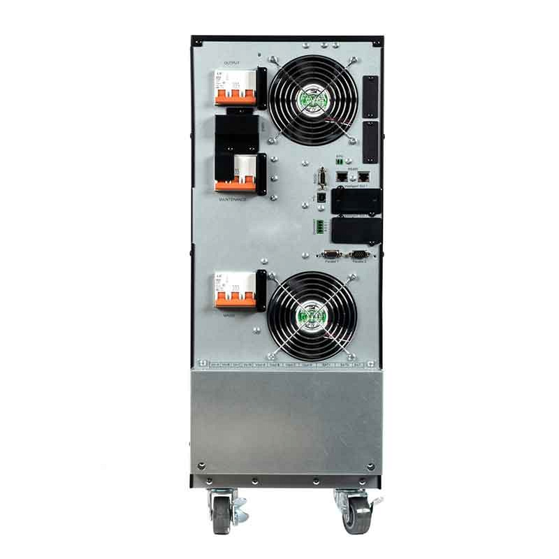 Трёхфазный online ИБП SKAT 15-3/3 подойдёт для обеспечения качественным током сетевого оборудования, учреждений, финансовой и транспортных сфер, вычислительных сетей, телекоммуникаций, управления технологическими процессами и других ответственных объектов. Со временем можно масштабировать мощность, подключая до 4 источников бесперебойного питания параллельно. SKAT 15-3/3 работает от внешних аккумуляторов и отслеживает их состояние. Заряд производится в 3 этапа при помощи интеллектуального ЗУ мощностью 14 А, такой подход существенно продливает срок службы батарей. При помощи ЖК-дисплея можно узнать о статусе ИБП, выбрать режим работы и настроить параметры. На задней панели предусмотрены порты для RS 232, USB, сухие контакты, EPO и SNMP.