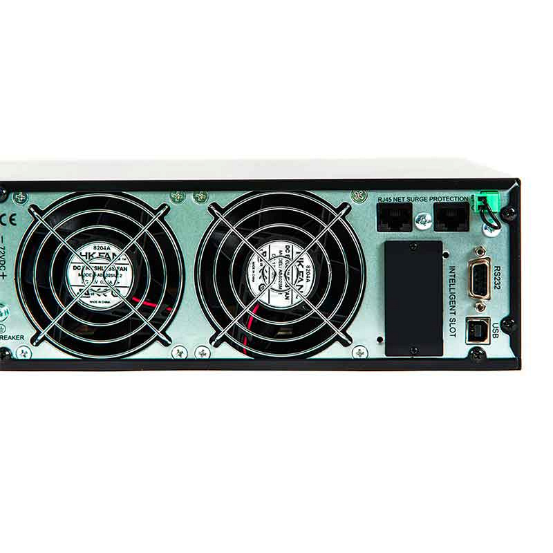 Однофазный источник бесперебойного питания SKAT 3000 RACK производится мощностью 3 кВА / 2.7 кВт по технологии двойного преобразования(Online) высотой 2U. Online топология обеспечивает надёжную защиту оборудования от любых неполадок сети: скачки напряжения, помехи, отключение электричества и другие. SKAT 3000 RACK работает только от 6 внешних аккумуляторных батарей ёмкостью от 40-120 Ач каждый (внутри ИБП аккумуляторов нет). При отсутствии напряжения сети можно запустить оборудование от них: ИБП поддерживает функцию «холодного» старта. Переключение на работу от АКБ происходит моментально, при этом сохраняется высокое качество подаваемого тока. Для заряда внешних аккумуляторов в ИБП установлено зарядное устройство мощностью 6А. На задней панели однофазного ИБП расположены евророзетки. Это позволяет подключать питаемое оборудование напрямую к ИБП. Универсальный форм фактор позволяет установить источник бесперебойного питания на пол, в стандартную стойку или шкаф: все необходимые монтажные элементы входят в комплект поставки.
