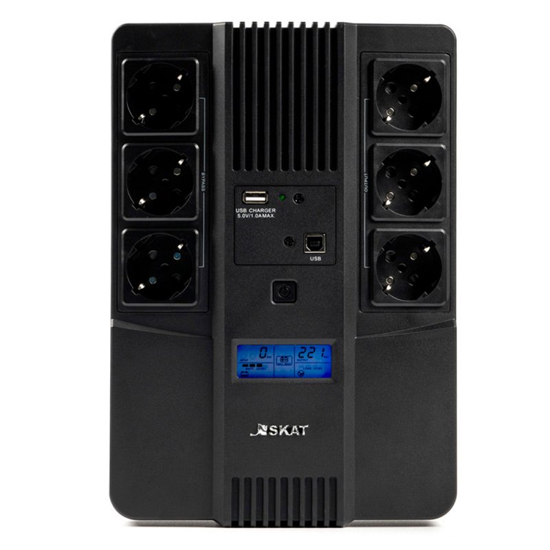 Однофазный источник бесперебойного питания SKAT-UPS 800-AID-IN-1x9 производится мощностью 800 ВА \ 480 Вт с применением линейно-интерактивной технологии (line-interactive UPS). Компактный корпус выполнен в напольном форм-факторе и подходит для монтажа на вертикальную поверхность. ИБП обеспечивает защиту оборудования от основных неполадок сети и обеспечивает время автономии для компьютеров, периферии, бытовой и офисной техники. Внутри SKAT-UPS 800-AID-IN-1x9 установлен свинцово-кислотный аккумулятор, напряжением 12 В и ёмкостью 9 Ач. Выводы выполнены в виде стандартных ЕВРО-розеток, так же для удобства предусмотрен USB порт. ИБП поддерживает функцию холодного старта — запуск без напряжения в сети, запускаясь от встроенного АКБ. Для отслеживания состояния оборудования предусмотрена светодиодная индикация и дисплей, проублированные звуковыми сигналами.