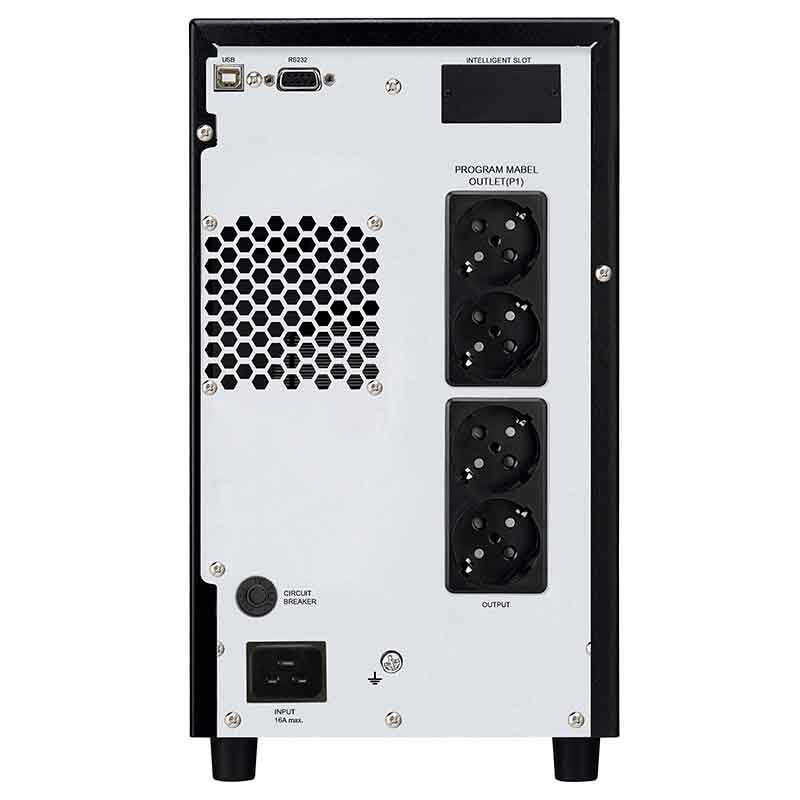 Однофазный онлайн ИБП Eltena Monolith N3000 работает от внутренних свинцово-кислотных АКБ (6 шт. х 12 В х 9 Ач). Выводы расположены на задней панели и выполнены в виде стандартных евро-розеток. Также сзади располагаются слоты для дополнительных интерфейсов, сетевые карты и другие опции приобретаются отдельно. Они позволяют расширить функционал Eltena Monolith N3000. Например, SNMP карта предоставляет возможность дистанционного управление источником бесперебойного питания, используя компьютер с выходом в интернет и стандартный браузер. Кулеры системы охлаждения работают тихо, шум на расстоянии 1 метра от источника бесперебойного питания не превышает 50 дБ.