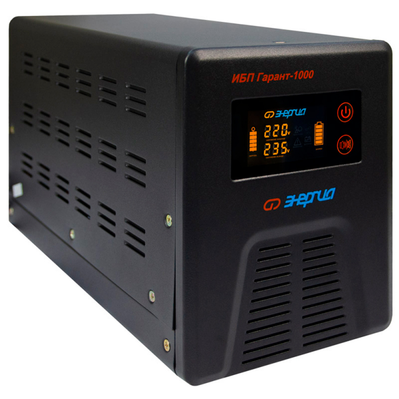 Однофазный line-interactive ИБП Энергия Гарант 1000 это напольный ИБП мощностью 1000 ВА / 600 Вт. Источник бесперебойного питания работает от внешней аккумуляторной батареи. Это существенно упрощает обслуживание и позволяет подключить АКБ достаточной ёмкости. На задней панели расположены выводы, они сделаны в виде стандартных евро-розеток и к ним напрямую можно подключать оборудование. ИБП Энергия Гарант 1000 защищает потребителей от перепадов напряжения, аномальных значений напряжения в сети, перегрева, перегрузки по току, коротких замыканий, неправильной полярности при подключении, перезаряда и полного разряда АКБ. Выходное напряжение имеет форму правильной синусоиды. На передней панели расположен цветной LED дисплей, также предусмотрены звуковые сигналы.