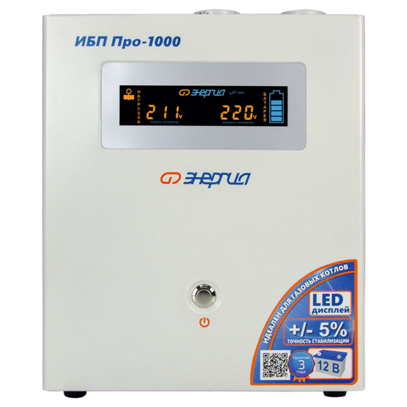 Однофазный линейно-интерактивный ИБП Энергия Про 1000 выпускается мощностью 1000 ВА / 700 Вт в универсальном корпусе с возможностью настенного размещения. Выводы источника бесперебойного питания выполнены в виде Schuko (евро) розеток. На передней панели расположен цветной информационный LED-дисплей. Форма выходного сигнала Энергия Про 1000 в — чистый синус. Время автономной работы можно наращивать, устанавливая дополнитеьлные свинцово-кислотные батареи. Однофазный ИБП Энергия Про 1000 защищает от повышенного и пониженного напряжения, перегрева трансформатора, перезаряда и глубокой разрядки батарей, коротких замыканий, неправильной полярности, перегрузки по току.