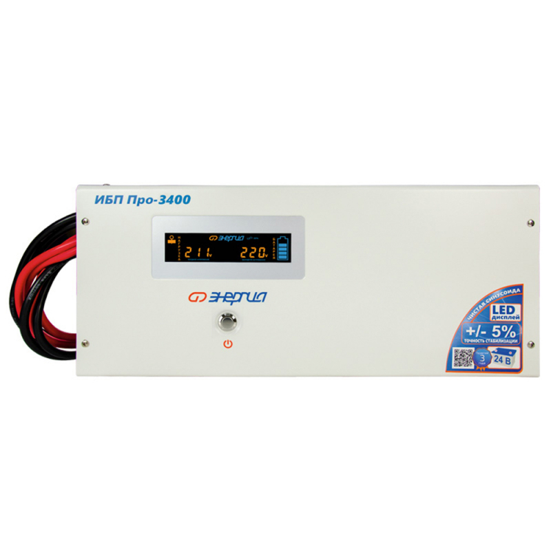 Однофазный линейно-интерактивный ИБП Энергия Про 3400 выпускается мощностью 3400 ВА / 2400 Вт в универсальном корпусе с возможностью настенного размещения. Выводы источника бесперебойного питания выполнены в виде Schuko (евро) розеток. На передней панели расположен цветной информационный LED-дисплей. Форма выходного сигнала Энергия Про 3400 в — чистый синус. Время автономной работы можно наращивать, устанавливая дополнитеьлные свинцово-кислотные батареи. Однофазный ИБП Энергия Про 3400 защищает от повышенного и пониженного напряжения, перегрева трансформатора, перезаряда и глубокой разрядки батарей, коротких замыканий, неправильной полярности, перегрузки по току.