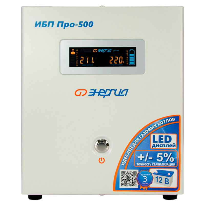 Однофазный линейно-интерактивный ИБП Энергия Про 500 выпускается мощностью 500 ВА / 300 Вт в универсальном корпусе с возможностью настенного размещения. Выводы источника бесперебойного питания выполнены в виде Schuko (евро) розеток. На передней панели расположен цветной информационный LED-дисплей. Форма выходного сигнала Энергия Про 500 в — чистый синус. Время автономной работы можно наращивать, устанавливая дополнитеьлные свинцово-кислотные батареи. Однофазный ИБП Энергия Про 500 защищает от повышенного и пониженного напряжения, перегрева трансформатора, перезаряда и глубокой разрядки батарей, коротких замыканий, неправильной полярности, перегрузки по току.