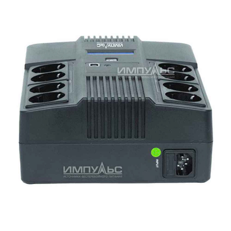 Линейно-интерактивный однофазный источник бесперебойного питания ИМПУСЛЬС МАСТЕР 800 мощностью 800 ВА / 480 Вт отлично подходит для защиты домашнего ПК, малых офисов, аудио/видео оборудования, рабочих станций и другой техники. Компактный размер и удобное расположение выводов позволяет разместить ИБП под рабочим столом или даже повесить вертикально. Внутри ИМПУЛЬС МАСТЕР 800 установлен свинцово-кислотный 12 В АКБ ёмкостью 9 Ач с поддержкой «холодного» пуска. Выводы расположены в верхней части корпуса и выполнены в виде стандартных евро-розеток (Schuko), для зарядки мобильных телефонов и других устройств предусмотрен отдельный USB-порт.
