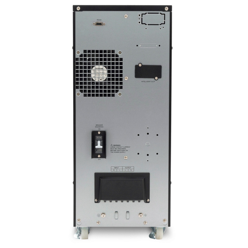 На задней панели однофазного IPPON Novus NOVUS 10K располагается клеммная колодка и следующие разъёмы: универсальный слот для опциональных карт, EPO, сухие контакты, RS232, плата для параллельного подключения. Опции не входят в комплект поставки и приобретаются отдельно, более подробную информацию смотрите в разделе «Аксессуары». Они позволяют существенно расширить функционал онлайн ИБП, например, удалённо следить за состоянием оборудования и управлять им. Система активного охлаждения также выведена на заднюю панель, шум от неё не превышает 50 дБ, а значит IPPON Novus NOVUS 10K можно использовать даже в офисных помещениях.