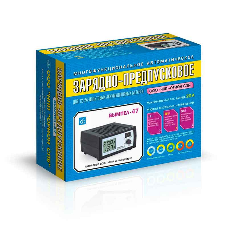 Автоматическое зарядное устройство Вымпел-47 предназначено для зарядки 12 и 24 В авто и мото аккумуляторов любого типа и ёмкости. ЗУ использует алгоритм заряда по принципу плавного уменьшения тока и снабжено защитой от короткого замыкания, переполюсовки и перегрева. На передней панели расположен сегментированный ЖК-дисплей для отслеживания состояния аккумуляторов. Регулировка тока на Вымпел-47 плавная, а напряжение настраивается переключателем. Во избежание перегрева внутри зарядного устройства установлено активное охлаждение в виде микровентилятора. Также Вымпел-47 может использоваться как блок питания. У ЗУ для дополнительной защиты предусмотрен плавкий предохранитель на проводе. Более подробную информацию о схеме подключения, режимах эксплуатации и характеристиках можно получить во вкладке «Документы».