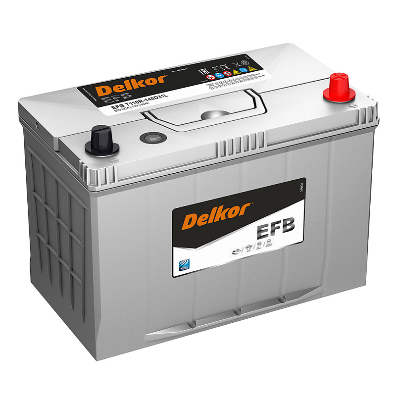 Автомобильный аккумулятор DELKOR EFB 90 обр (145D31L) (12 В, 90 Ач, 820 А, полярность обратная) производится в Южной Корее по технологии EFB (Enhanced Flooded Battery) для легковых азиатских автомобилей с поддержкой Start-Stop. Эта система автоматически отключает двигатель при кратковременных остановках и моментально запускает его при нажатии педали газа. Такое решение существенно экономит топливо и снижает количество вредных выбросов, обычно используется для городских автомобилей, где часто приходится останавливаться на светофорах. При производстве DELKOR EFB 90 обр (145D31L) используется только первичный свинец, легированный кальцием, оловом и серебром. Это существенно улучшает устойчивость аккумулятора к коррозии и снижает саморазряд.