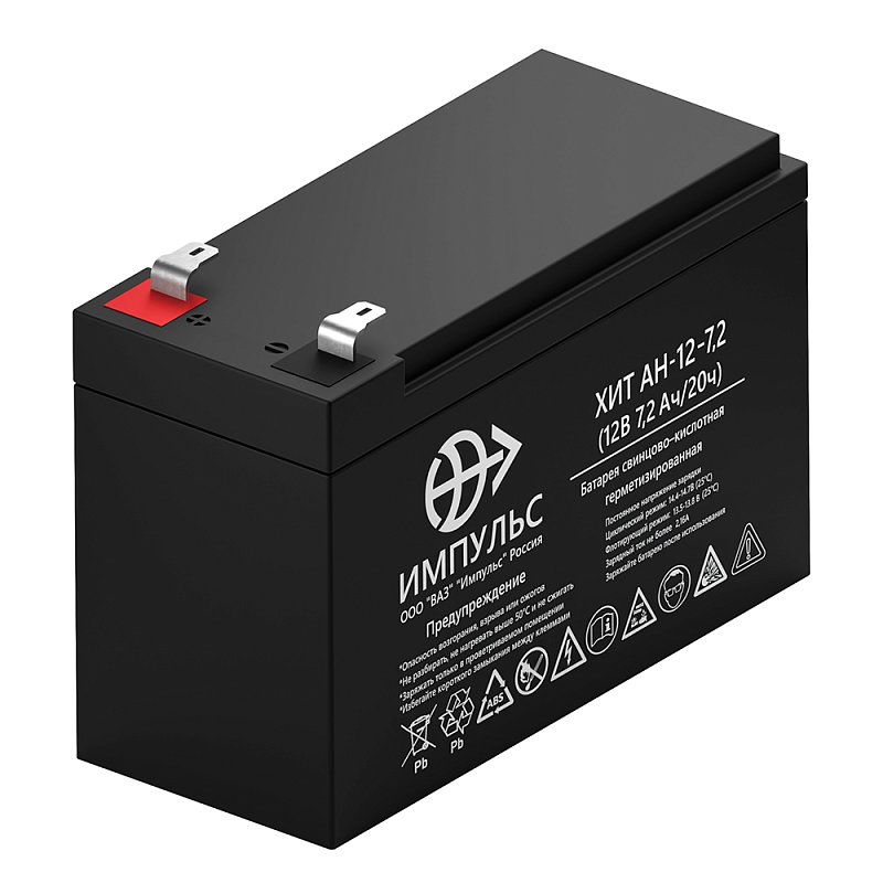 Герметизированный необслуживаемый свинцово-кислотный аккумулятор ВАЗ Импульс ХИТ АН 12-7.2 (12 В; 7.2 Ач) производится по техническим условиям ЖТПИ.563415.001 ТУ, что обеспечивает повышенную надёжность, проверенную испытаниями и подходит для ответственных узлов. Батарея изготовлена по технологии AGM: микропористый стекловолоконный сепаратор удерживает кислотный раствор. Это положительно сказывается на сроке службы акб: циклический ресурс по ГОСТ Р МЭК 60896-21 составляет 400 циклов или 10 лет в буферном режиме. ВАЗ Импульс ХИТ АН 12-7 не требует обслуживания, под давлением рекомбинируется более 98% газов.