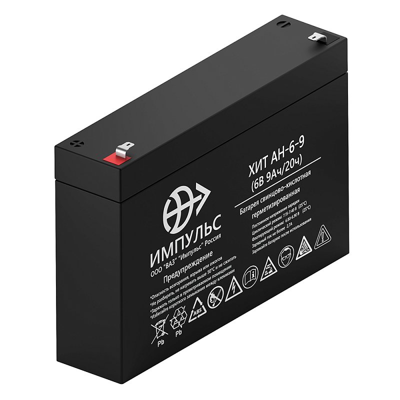 Герметизированный необслуживаемый свинцово-кислотный аккумулятор ВАЗ Импульс ХИТ АН 6-9 (6 В; 9 Ач) производится по техническим условиям ЖТПИ.563415.001 ТУ, что обеспечивает повышенную надёжность, проверенную испытаниями и подходит для ответственных узлов. Батарея изготовлена по технологии AGM: микропористый стекловолоконный сепаратор удерживает кислотный раствор. Это положительно сказывается на сроке службы акб: циклический ресурс по ГОСТ Р МЭК 60896-21 составляет 400 циклов или 10 лет в буферном режиме. ВАЗ Импульс ХИТ АН 6-9 не требует обслуживания, под давлением рекомбинируется более 98% газов.