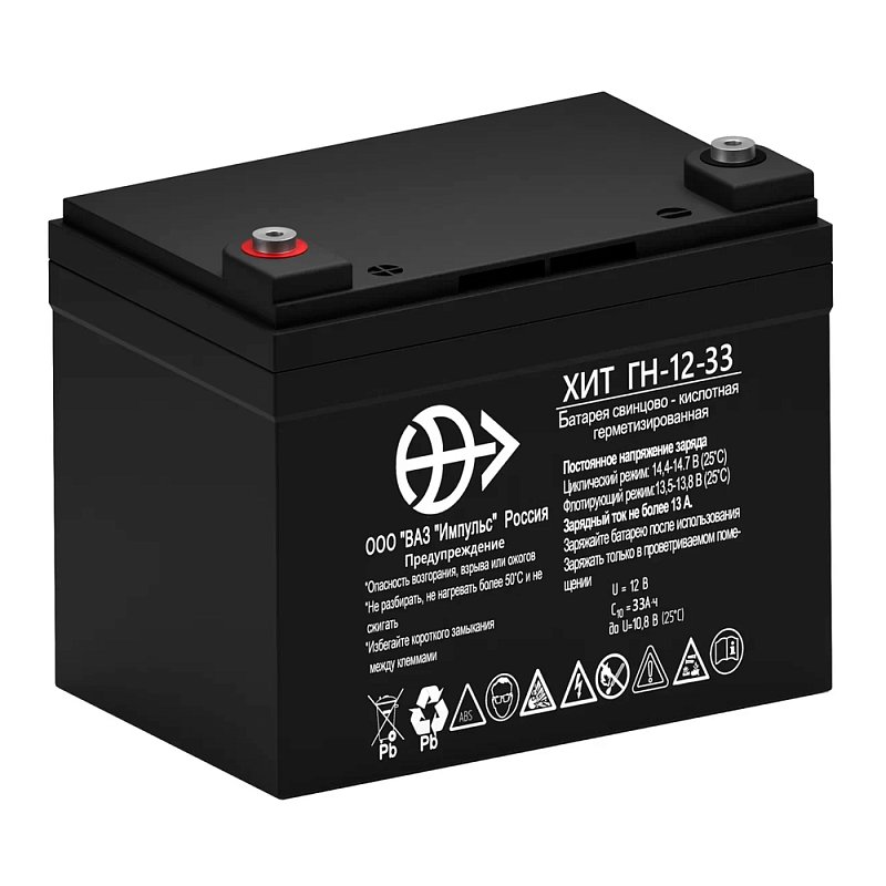 Свинцово-кислотный гелевый аккумулятор ВАЗ Импульс ХИТ ГН 12-33 производится напряжением 12 В ёмкостью 33 Ач по технологии GEL. Электролит находится в желеобразном состоянии, что положительно сказывается на устойчивости батареи к воздействию вибраций, температур, глубоких разрядов и продолжительности срока службы: более 600 циклов или 15 лет в буферном режиме. ВАЗ Импульс ХИТ ГН 12-33 соответствует техническим стандартам ЖТПИ .563415.001ТУ. Батарея не требует обслуживания и может эксплуатироваться в помещениях с естественной вентиляцией и работающим персоналом.