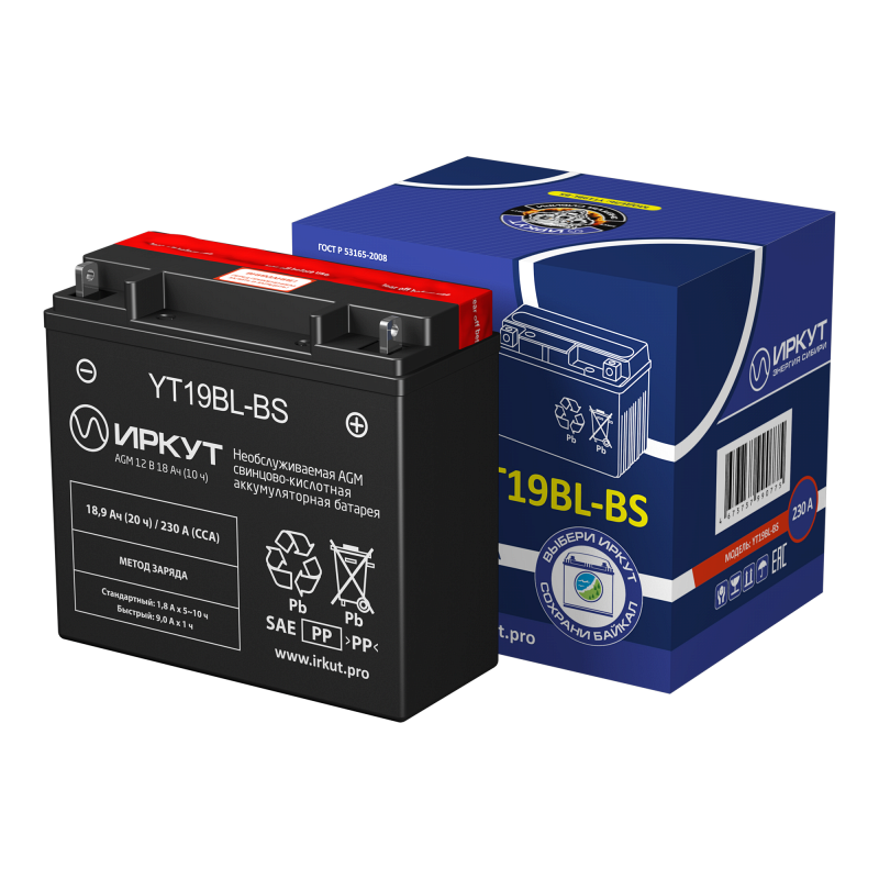 Сухозарядный стартерный аккумулятор Иркут YT19BL-BS (напряжение 12 В, ёмкость 18 Ач) разработан специально для мототехники. Его главная особенность — повышенная виброустойчивость. Электролит поставляется отдельно, что обеспечивает повышенный срок хранения до заправки батареи. Иркут YT19BL-BS производится по технологии AGM — кислота удерживается неподвижно внутри мелкопористых стекловолоконных сепараторов. Это повышает устойчивость к температурному воздействию. Дата производства аккумулятора Иркут YT19BL-BS указана на крышке в виде символьного кода.
