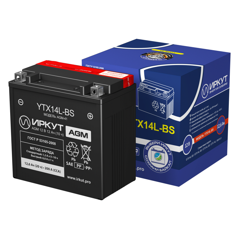 Сухозарядный стартерный аккумулятор Иркут YTX14L-BS (напряжение 12 В, ёмкость 12 Ач) разработан специально для мототехники. Его главная особенность — повышенная виброустойчивость. Электролит поставляется отдельно, что обеспечивает повышенный срок хранения до заправки батареи. Иркут YTX14L-BS производится по технологии AGM — кислота удерживается неподвижно внутри мелкопористых стекловолоконных сепараторов. Это повышает устойчивость к температурному воздействию. Дата производства аккумулятора Иркут YTX14L-BS указана на крышке в виде символьного кода.