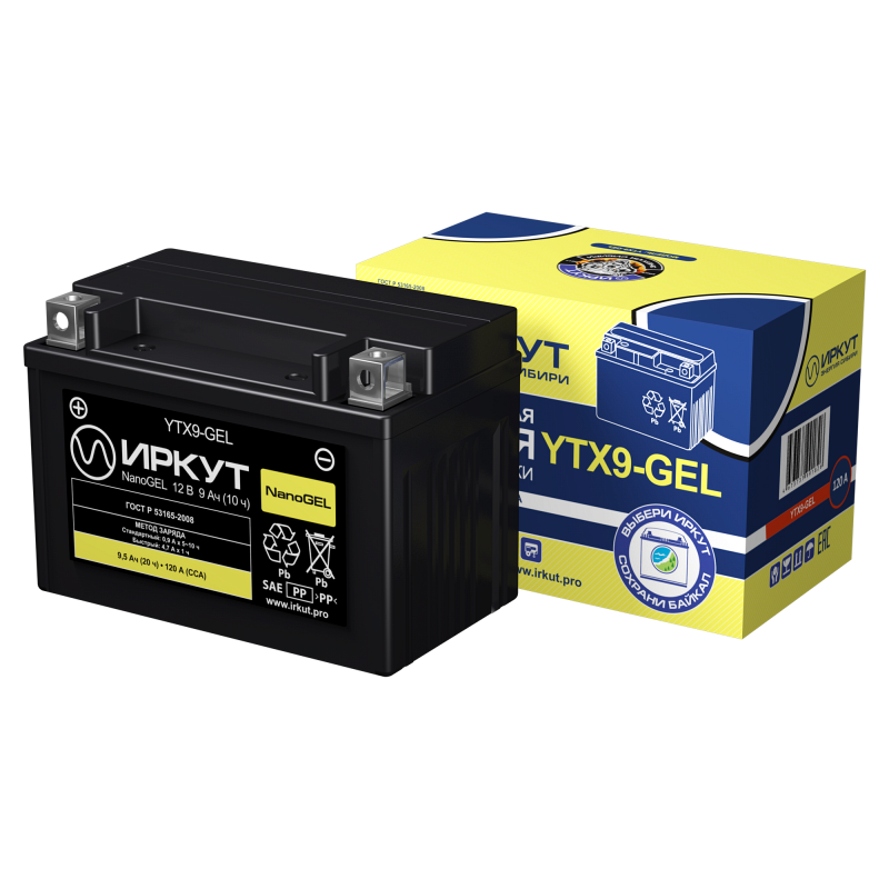 Стартерный аккумулятор Иркут YTX9-GEL (напряжение 12 В, ёмкость 9 Ач) разработан специально для мототехники. Его главная особенность — повышенная виброустойчивость. Иркут YTX9-GEL производится по технологии GEL — кислота удерживается неподвижно внутри мелкопористых стекловолоконных сепараторов. Это повышает устойчивость к температурному воздействию. Дата производства аккумулятора Иркут YTX9-GEL указана на крышке в виде символьного кода.
