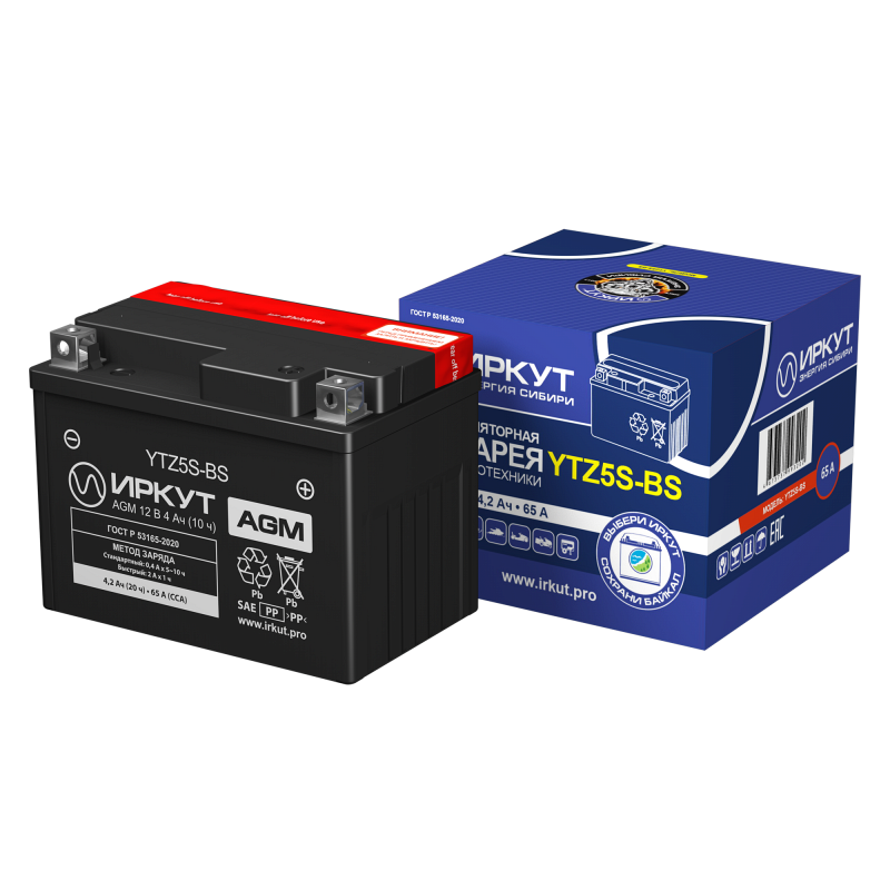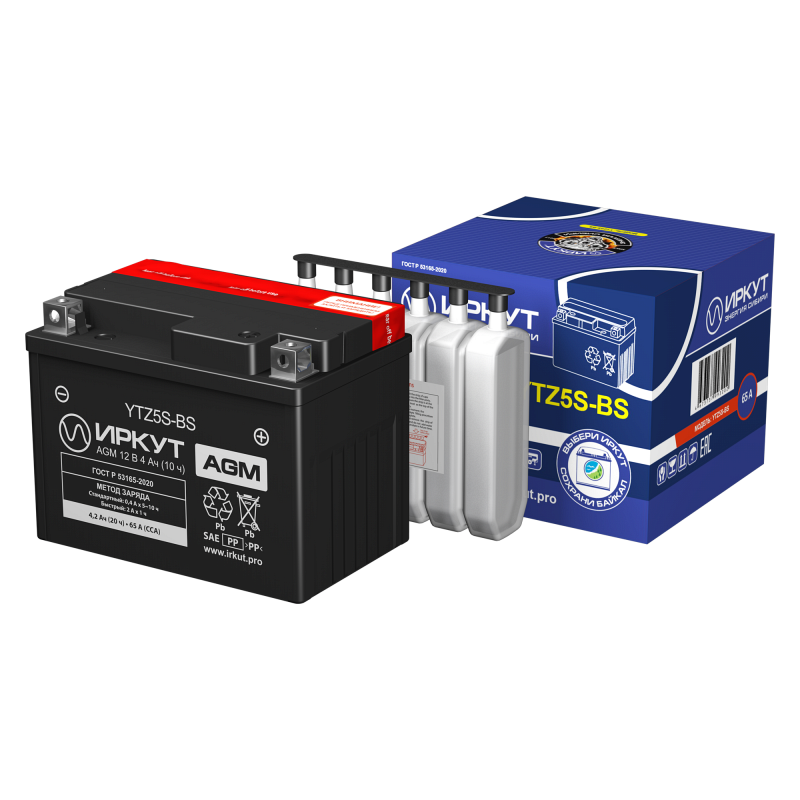 Сухозарядный стартерный аккумулятор Иркут YTZ5S-BS (напряжение 12 В, ёмкость 4 Ач) разработан специально для мототехники. Его главная особенность — повышенная виброустойчивость. Электролит поставляется отдельно, что обеспечивает повышенный срок хранения до заправки батареи. Иркут YTZ5S-BS производится по технологии AGM — кислота удерживается неподвижно внутри мелкопористых стекловолоконных сепараторов. Это повышает устойчивость к температурному воздействию. Дата производства аккумулятора Иркут YTZ5S-BS указана на крышке в виде символьного кода.
