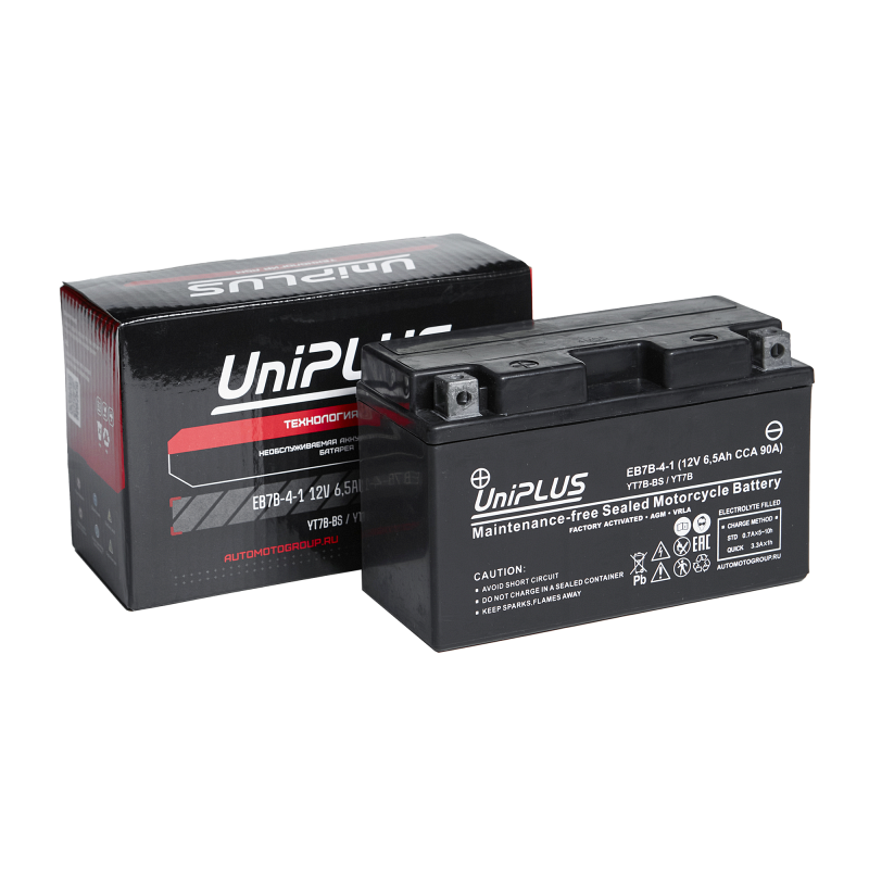 Аккумулятор Uplus EB7B-4 (ёмкость 6.5 Ач, напряжение 12 В) разработан специально для мототехники по технологии AGM. Батареи этой серии выделяются целым рядом особенностей: высокие пусковые и стартерные токи, быстрый приём заряда и продолжительный срок службы. Пусковой ток составляет (CCA) 90 А, полярность клемм у батареи прямая (+-). Корпус из прочного полимера надёжно запаян, что защищает АКБ от протеканий и обеспечивает повышенную виброустойчивость. Благодаря сульфатоустойчивым пластинам Uplus EB7B-4 обладает продолжительным сроком службы, он достигает 5 лет при правильной эксплуатации. Обслуживание не требуется. Мото аккумулятор активирован на заводе и полностью готов к эксплуатации. АКБ Uplus EB7B-4 можно использовать в широком температурном спектре: от -40 до +40 °C. Это позволяет применять батарею не только для мотоциклов, квадроциклов, садовой и спецтехники, но и в зимний период для снегоходов. Свинцово-кислотный мотоаккумулятор Uplus EB7B-4 является полным аналогом следующих моделей: YT7B-BS и YT7B-4.