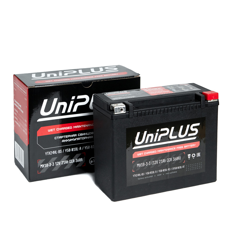 Аккумулятор Uplus MX18-3 (ёмкость 20 Ач, напряжение 12 В) разработан специально для мототехники по технологии AGM. Специальная конструкция пластин батареи обеспечивает на 10-20% большее время непрерывного запуска и отличную пусковую мощность, позволяющую запускать двигатель даже при низком заряде. Пусковой ток составляет (CCA) 340 А, полярность клемм у батареи обратная (-+). Корпус из прочного полимера надёжно запаян, что защищает АКБ от протеканий и обеспечивает повышенную виброустойчивость. Благодаря сульфатоустойчивым пластинам Uplus MX18-3 обладает продолжительным сроком службы, он достигает 5 лет при правильной эксплуатации. Обслуживание не требуется. Мото аккумулятор активирован на заводе и полностью готов к эксплуатации. АКБ Uplus MX18-3 можно использовать в широком температурном спектре: от -40 до +40 °C. Это позволяет применять батарею не только для мотоциклов, квадроциклов, садовой и спецтехники, но и в зимний период для снегоходов. Свинцово-кислотный мотоаккумулятор Uplus MX18-3 является полным аналогом следующих моделей: YTX18, Y50-N18L-A и Y50-N18-A3.