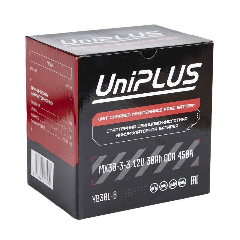 Аккумулятор Uplus MX30-3 (ёмкость 30 Ач, напряжение 12 В) разработан специально для мототехники по технологии AGM. Специальная конструкция пластин батареи обеспечивает на 10-20% большее время непрерывного запуска и отличную пусковую мощность, позволяющую запускать двигатель даже при низком заряде. Пусковой ток составляет (CCA) 440 А, полярность клемм у батареи обратная (-+). Корпус из прочного полимера надёжно запаян, что защищает АКБ от протеканий и обеспечивает повышенную виброустойчивость. Благодаря сульфатоустойчивым пластинам Uplus MX30-3 обладает продолжительным сроком службы, он достигает 5 лет при правильной эксплуатации. Обслуживание не требуется. Мото аккумулятор активирован на заводе и полностью готов к эксплуатации. АКБ Uplus MX30-3 можно использовать в широком температурном спектре: от -40 до +40 °C. Это позволяет применять батарею не только для мотоциклов, квадроциклов, садовой и спецтехники, но и в зимний период для снегоходов. Свинцово-кислотный мотоаккумулятор Uplus MX30-3 является полным аналогом следующих моделей: GYZ32HL, YB30L-B и YIX30L.