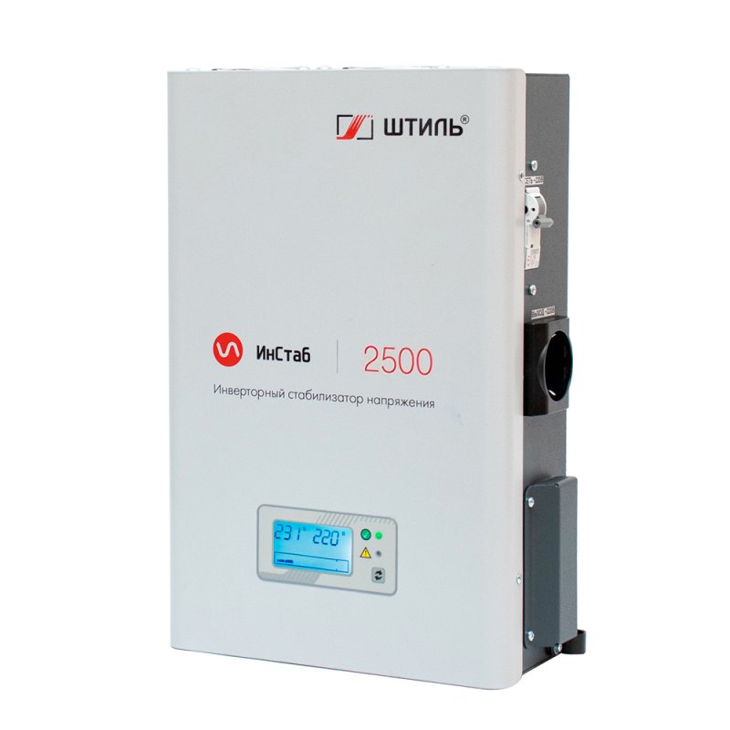 Однофазный (1-1) настенный инверторный стабилизатор напряжения Штиль IS2500 производится в России мощностью 2.5 кВА / 2 кВт. Он подходит для обеспечения стабильного электропитания такого оборудования, как: системы ГВС и водоснабжения, компьютерной техники, телевизоров и аудио-видео аппаратуры, холодильников, электроинструментов и охранных систем. Штиль IS2500 разработан с учётом специфики российских электрических сетей и полностью соответствует требованиям Таможенного союза (ЕАС). Топология двойного преобразования (Online) обеспечивает целый ряд преимуществ: мгновенная реакция на изменение параметров сети (0 мс), высокая точность коррекции напряжения и выдаёт на выходе идеальную синусоиду. При кратковременном отключении сети нагрузка обеспечивается ещё 200 мс.