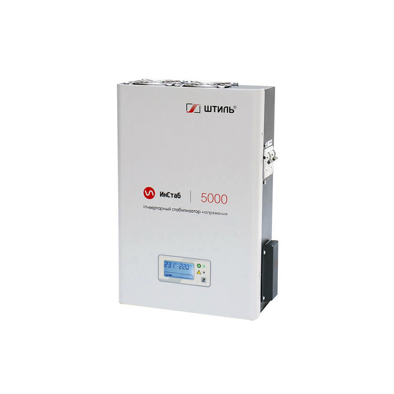 Однофазный (1-1) настенный инверторный стабилизатор напряжения Штиль IS5000 производится в России мощностью 5 кВА / 4.5 кВт. Он подходит для обеспечения стабильного электропитания такого оборудования, как: системы ГВС и водоснабжения, компьютерной техники, телевизоров и аудио-видео аппаратуры, холодильников, электроинструментов и охранных систем. Штиль IS5000 разработан с учётом специфики российских электрических сетей и полностью соответствует требованиям Таможенного союза (ЕАС). Топология двойного преобразования (Online) обеспечивает целый ряд преимуществ: мгновенная реакция на изменение параметров сети (0 мс), высокая точность коррекции напряжения и выдаёт на выходе идеальную синусоиду. При кратковременном отключении сети нагрузка обеспечивается ещё 200 мс.