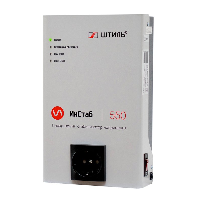 Однофазный (1-1) настенный инверторный стабилизатор напряжения Штиль IS550 производится в России мощностью 1 кВА / 0.8 кВт. Он подходит для обеспечения стабильного электропитания такого оборудования, как: системы ГВС и водоснабжения, компьютерной техники, телевизоров и аудио-видео аппаратуры, холодильников, электроинструментов и охранных систем. Штиль IS550 разработан с учётом специфики российских электрических сетей и полностью соответствует требованиям Таможенного союза (ЕАС). Топология двойного преобразования (Online) обеспечивает целый ряд преимуществ: мгновенная реакция на изменение параметров сети (0 мс), высокая точность коррекции напряжения и выдаёт на выходе идеальную синусоиду. При кратковременном отключении сети нагрузка обеспечивается ещё 200 мс.
