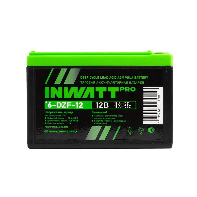 Тяговый свинцово-кислотный аккумулятор INWATT 6-DZF-12 (напряжение 12 В, ёмкость 18 Ач) производится по технологии AGM. Стекловолоконный сепаратор удерживает жидкий электролит неподвижно, что положительно сказывается на сроке службы и разрядных характеристиках батареи. Корпус выполнен из высокопрочного пластика и надёжно герметизирован, внутри поддерживается давление, обеспечивающее рекомбинацию газов (обслуживание не требуется). Внутри INWATT 6-DZF-12 установлены утолщённые свинцовые пластины из экологичного сплава без содержания кадмия и мышьяка. Аккумулятор подходит для эксплуатации в широком диапазоне температур, сохраняет производительность при высоких разрядных токах и подходит для ежедневного интенсивного использования. Срок службы свинцово-кислотного аккумулятора INWATT 6-DZF-12 при соблюдении правил эксплуатации составляет 4 года.