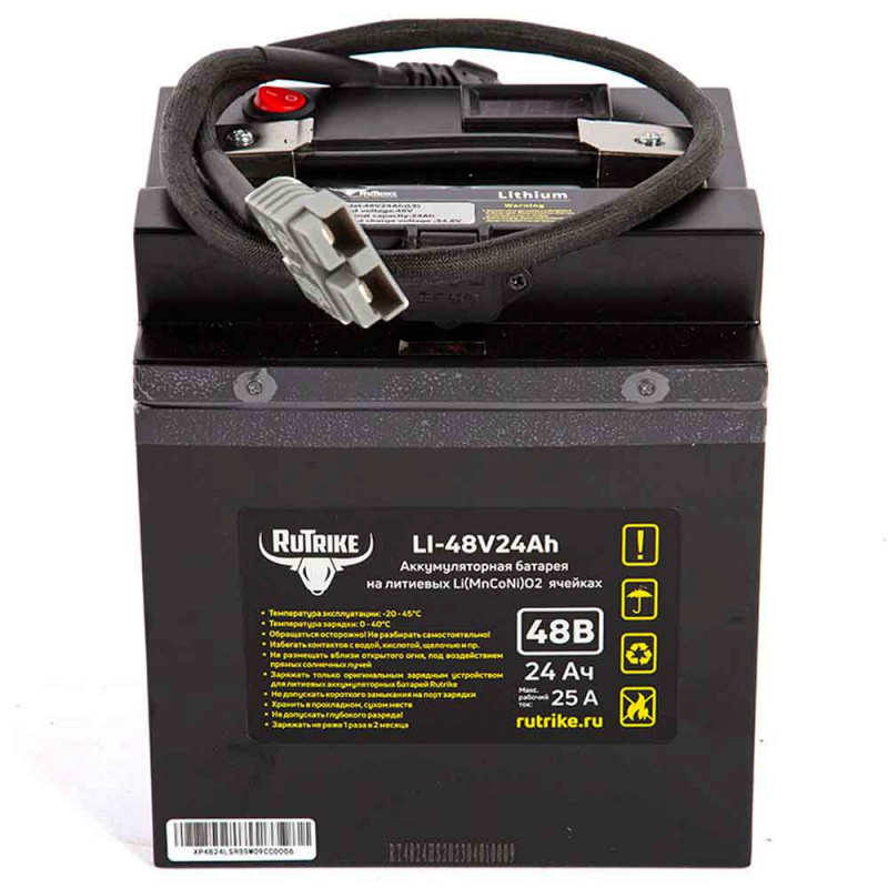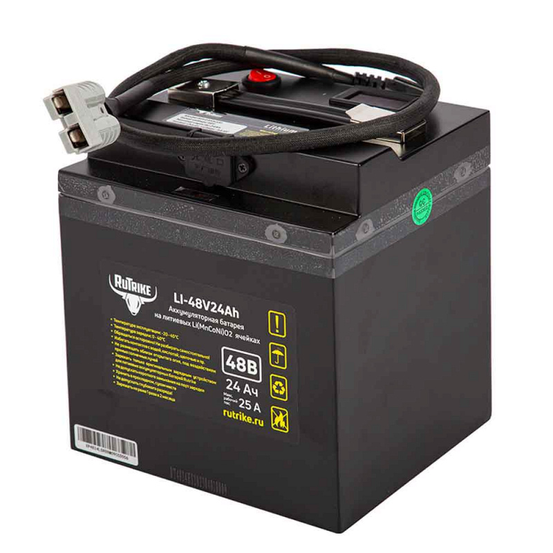 Тяговый аккумулятор RuTrike (18650 MnCoNi) 48V24A/H поставляется со встроенным блоком управления (Battery Management System), он регулирует параметры заряда и разряда, следит за температурой и защищает АКБ. Литиевая батарея предназначена для высоких нагрузок и обладает повышенной токоотдачей. Она подходит для любой поломоечной и уборочной техники от любых производителей, погрузчиков, автомобилей и мотоциклов с электрическими двигателями. Корпус выполнен из металла и надёжно герметизирован, клеммы выполнены в виде силового разъёма.