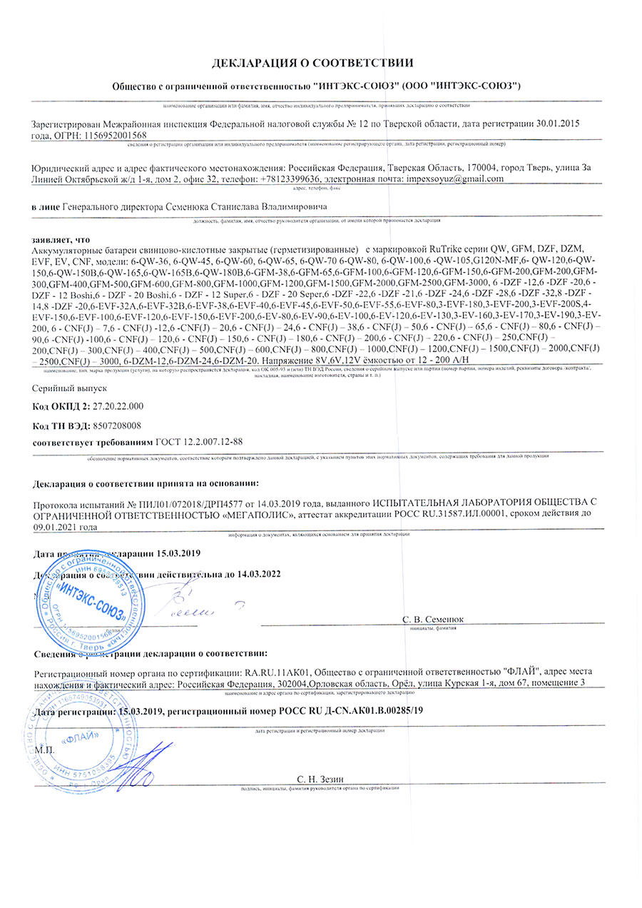 Подробное описание тягового аккумулятора RuTrike 6-F-33 Руководство по эксплуатации и гарантийный талон Декларация о соответствии Декларация о соответствииОтзывы пользователей