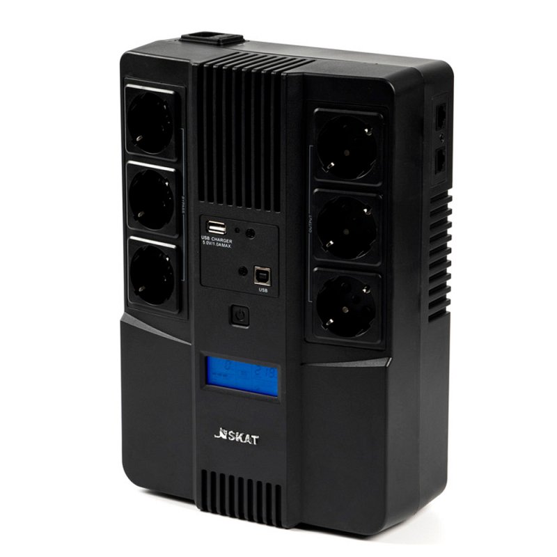 Однофазный источник бесперебойного питания SKAT-UPS 800-AID-IN-1x9 производится мощностью 800 ВА \ 480 Вт с применением линейно-интерактивной технологии (line-interactive UPS). Компактный корпус выполнен в напольном форм-факторе и подходит для монтажа на вертикальную поверхность. ИБП обеспечивает защиту оборудования от основных неполадок сети и обеспечивает время автономии для компьютеров, периферии, бытовой и офисной техники. Внутри SKAT-UPS 800-AID-IN-1x9 установлен свинцово-кислотный аккумулятор, напряжением 12 В и ёмкостью 9 Ач. Выводы выполнены в виде стандартных ЕВРО-розеток, так же для удобства предусмотрен USB порт. ИБП поддерживает функцию холодного старта — запуск без напряжения в сети, запускаясь от встроенного АКБ. Для отслеживания состояния оборудования предусмотрена светодиодная индикация и дисплей, проублированные звуковыми сигналами.