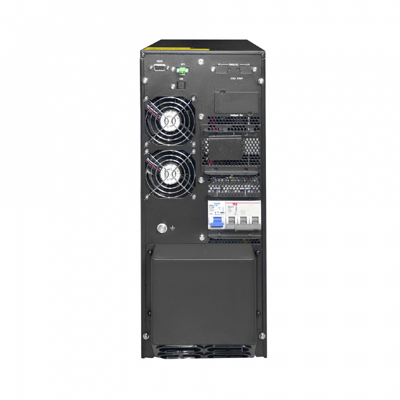 Для удобной настройки Hiden Expert HE31015XL на передней панели установлен информационный ЖК-дисплей. Он позволяет выбрать режим работы ИБП, узнать об ошибках и неисправностях, отследить состояние оборудования и аккумуляторов. На задней панели расположены слоты для: RS-232, USB и SNMP. Опции не входят в комплект поставляемого оборудования и приобретаются отдельно, более подробную информацию о них можно получить в разделе «Аксессуары». Рядом расположены выводы трёхфазного источника бесперебойного питания, которые выполнены в виде клеммного терминала. Hiden Expert HE31015XL обладает высокой перегрузочной способностью инвертора и статического байпаса. Повышенная отказоустойчивость ИБП также обеспечивается специальным защитным лаковым покрытием печатных плат. Трёхфазный источник бесперебойного питания поддерживает возможность параллельной работы N+X или наращиванием мощности (опционально).