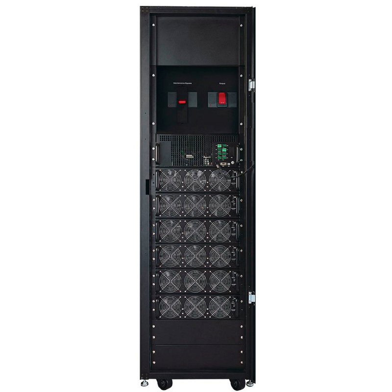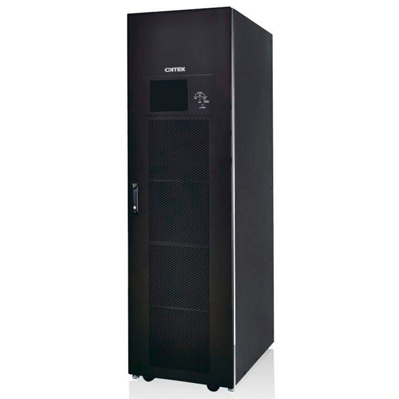 Трёхфазный онлайн ИБП Ontek MPM 305 производится в напольном исполнении мощностью 300 кВА / 300 кВт с топологией двойного преобразования (online). Источник бесперебойного питания обладает гибкой конфигурацией и отлично масштабируется. Внутри установлены силовые модули высотой 3U по 60 кВА, внутри каждого из них расположена плата управления. Это повышает отказоустойчивость системы. Трёхфазный онлайн ИБП Ontek MPM 305 работает от внешних свинцово-кислотных батарейных модулей. Доступен резерв по схеме N+1, N+X или горизонтальное расширение 1+1: два ИБП подключаются параллельно к общей батарейной ёмкости. Мощное ЗУ с регулируемым током с технологией трёхступенчатого заряда для более эффективной и безопасной зарядки акб. Ontek MPM 305 поддерживает запуск от батарей (холодный старт) и режим Power Walk-In для плавного перехода на работу от дизельного генератора. 10 дюймовый цветной сенсорный экран и звуковые уведомления помогают отследить и настроить состояние оборудования. Функционал трёхфазного источника бесперебойного питания можно расширить, подключив дополнительные интерфейсы: SNMP, Modbus, датчик окружающей среды и другие.