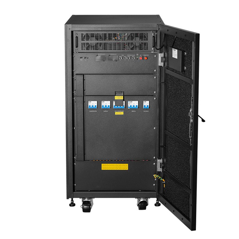 Трёхфазный Online источник бесперебойного питания СИП380А10БА.10-33/4АГ выпускается в России, 3 фазы на входе на выходе, мощность устройства составляет 10 кВА \ 10 кВт. Высокий коэффициент выходной мощности = 1 обусловлен топологией двойного преобразования. Это обеспечивает не только эффективную работу ИБП, но и абсолютную защиту питаемого оборудования от любых проблем с электропитанием. Для повышения отказоустойчивости СИП380А10БА.10-33/4АГ предусмотрен раздельный байпас, также бесперебойник хорошо выдерживает перегрузки. Трёхфазный источник бесперебойного питания работает от внутренних батарейных блоков, которые заряжаются мощным зарядным устройством, оно подаёт ток до 14 А. Компактный корпус выполнен в башенном форм-факторе, что позволяет установить ИБП даже в небольшом помещении. Уровень шума от системы активного охлаждения не превышает 55 дБ. На передней панели установлен сенсорный цветной ЖК дисплей с русским интерфейсом, с помощью него можно отслеживать состояние СИП380А10БА.10-33/4АГ и настраивать его режим работы. На задней панели находится клеммная колодка и слоты SNMP, USB, Modbus, dry contact, RS-232 и EPO.